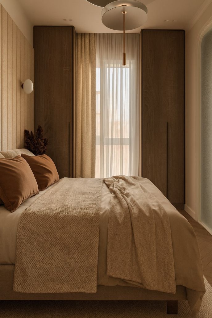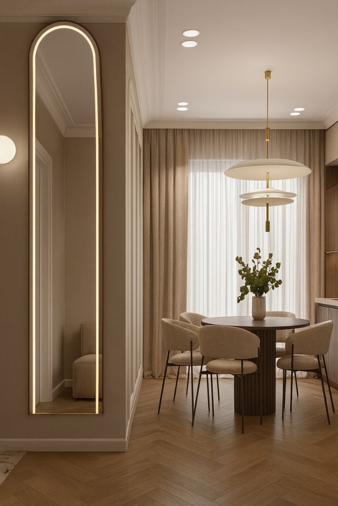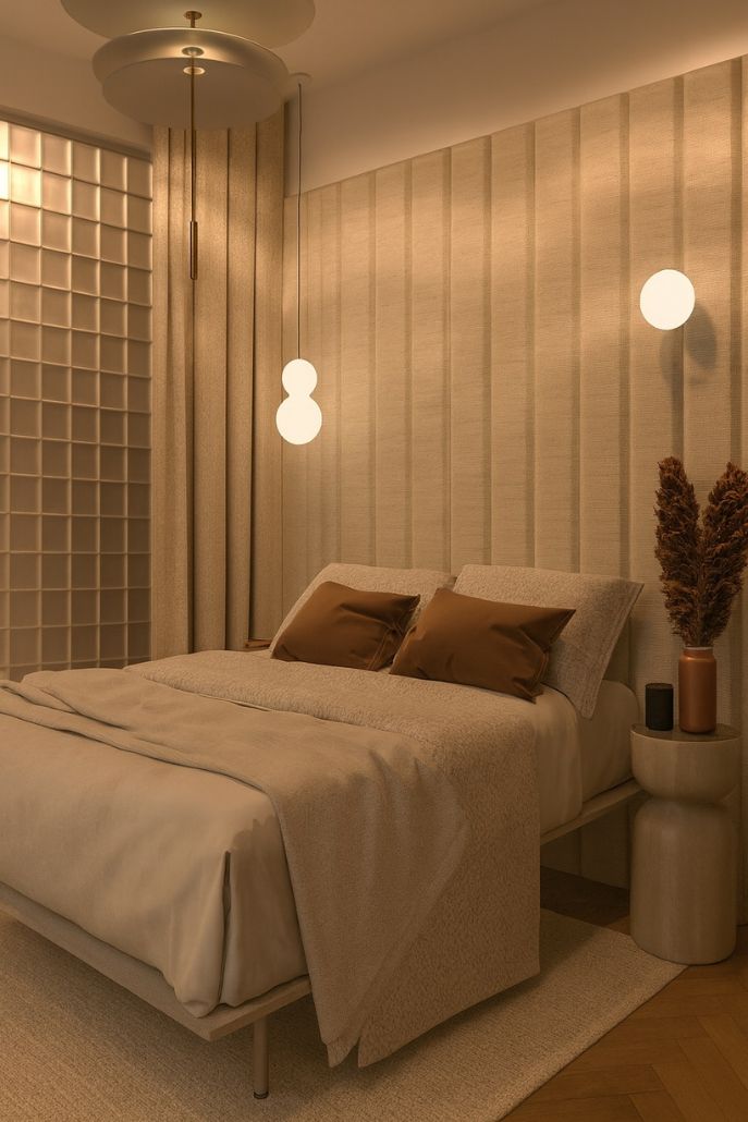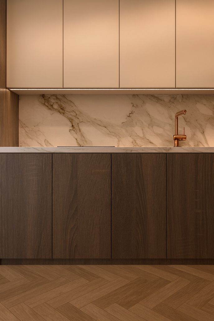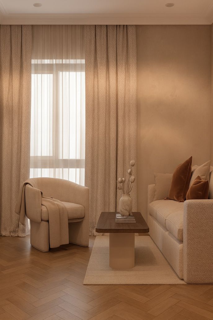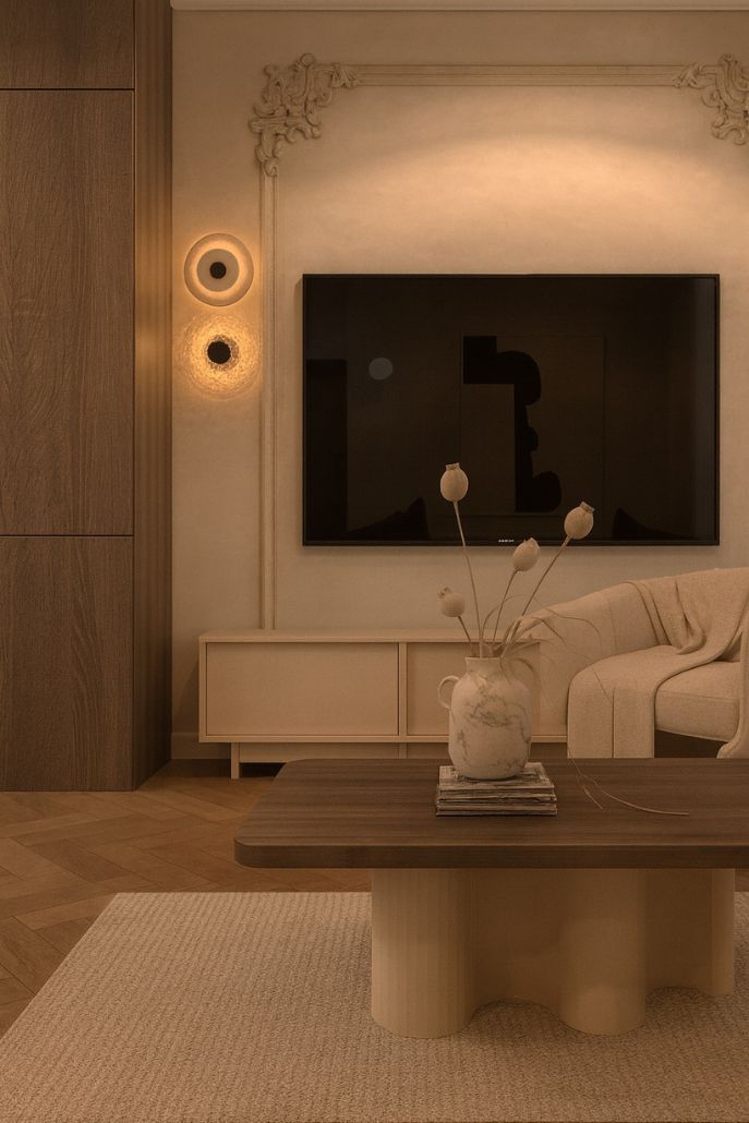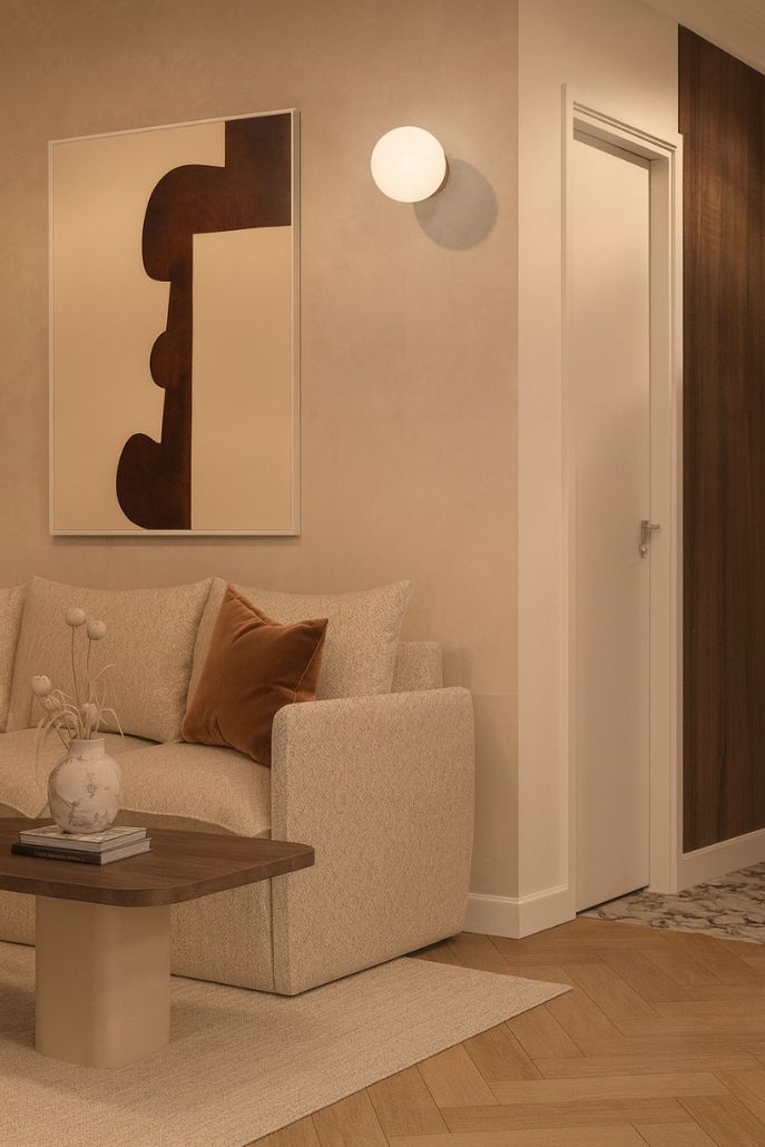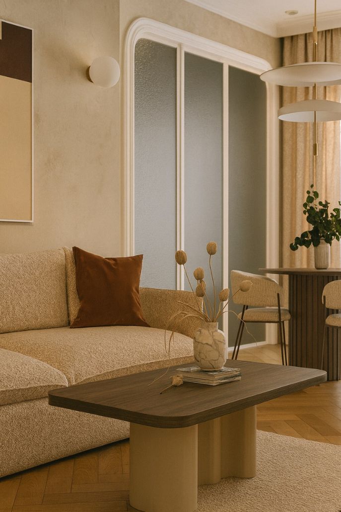 Wnętrza przedstawione na zdjęciach zaprojektowane są w stylu nowoczesnym z elementami minimalizmu i soft loft. Dominują ciepłe beże, brązy i naturalne materiały – drewno, tkaniny o wyraźnej fakturze, szkło strukturalne. Proste formy mebli łączą się z designerskimi dodatkami, jak geometryczne obrazy, oświetlenie o organicznych kształtach czy stoliki z marmurowymi detalami. Całość tworzy przytulną, elegancką i ponadczasową przestrzeń, idealną do relaksu.