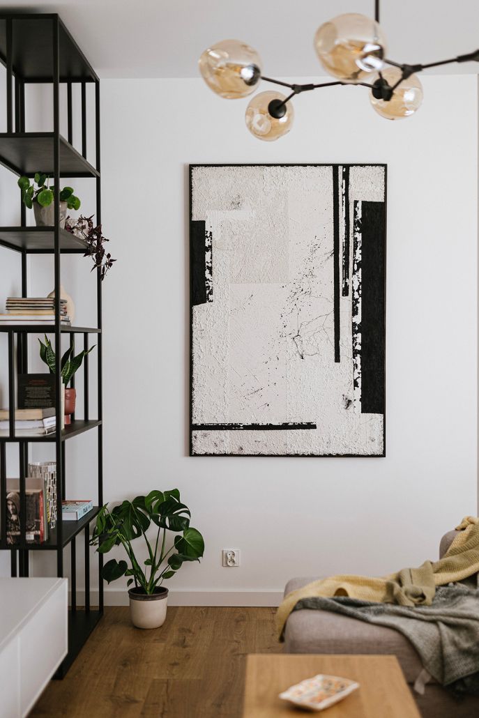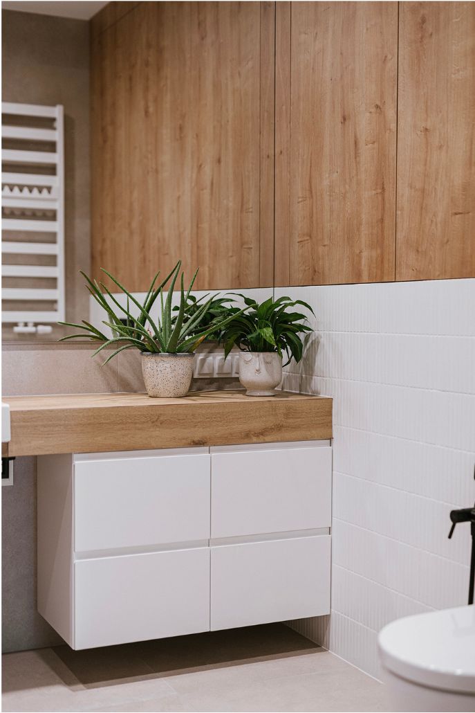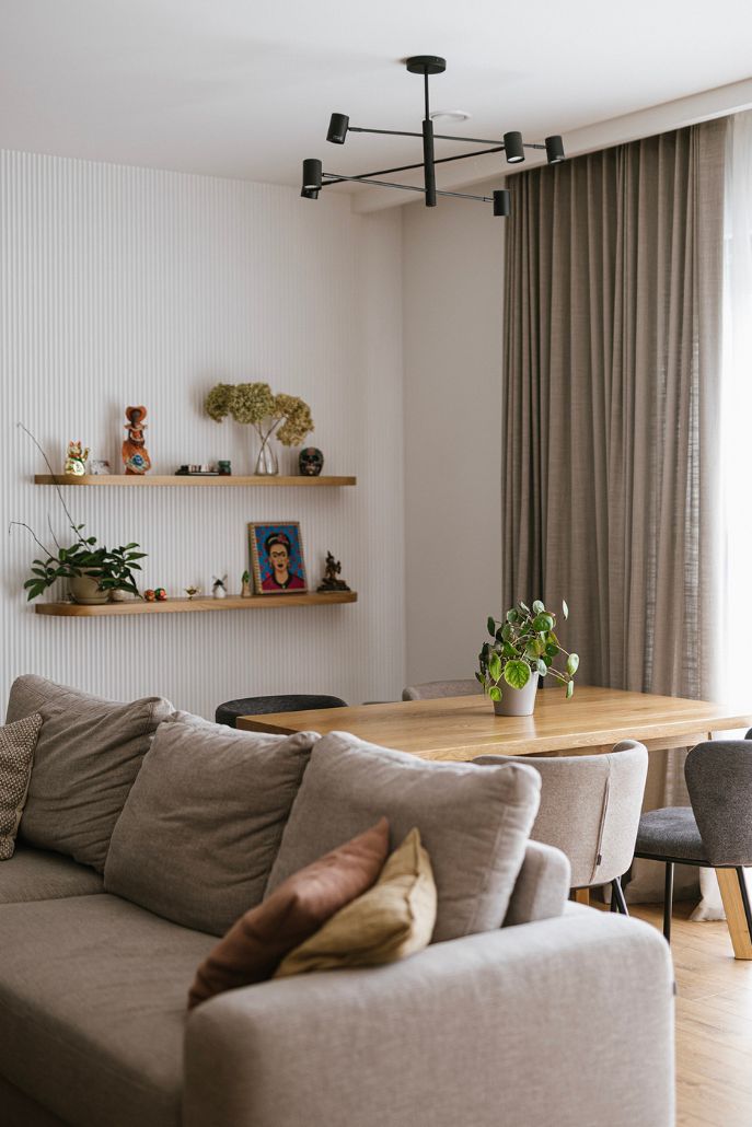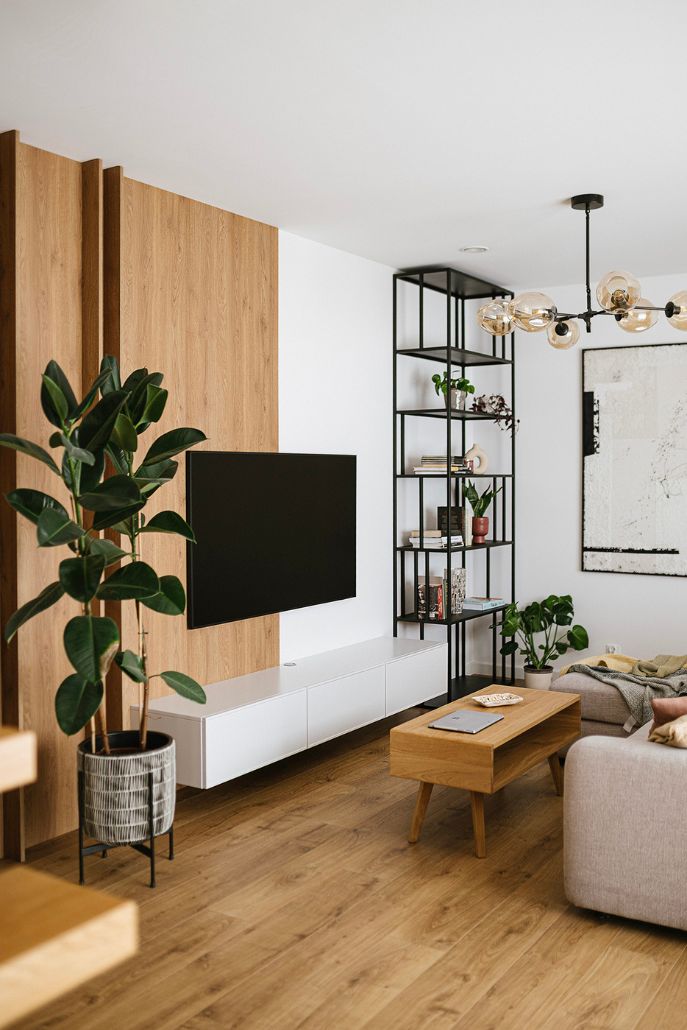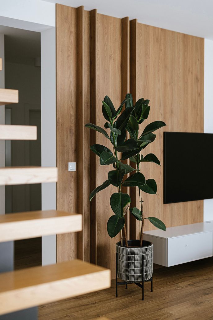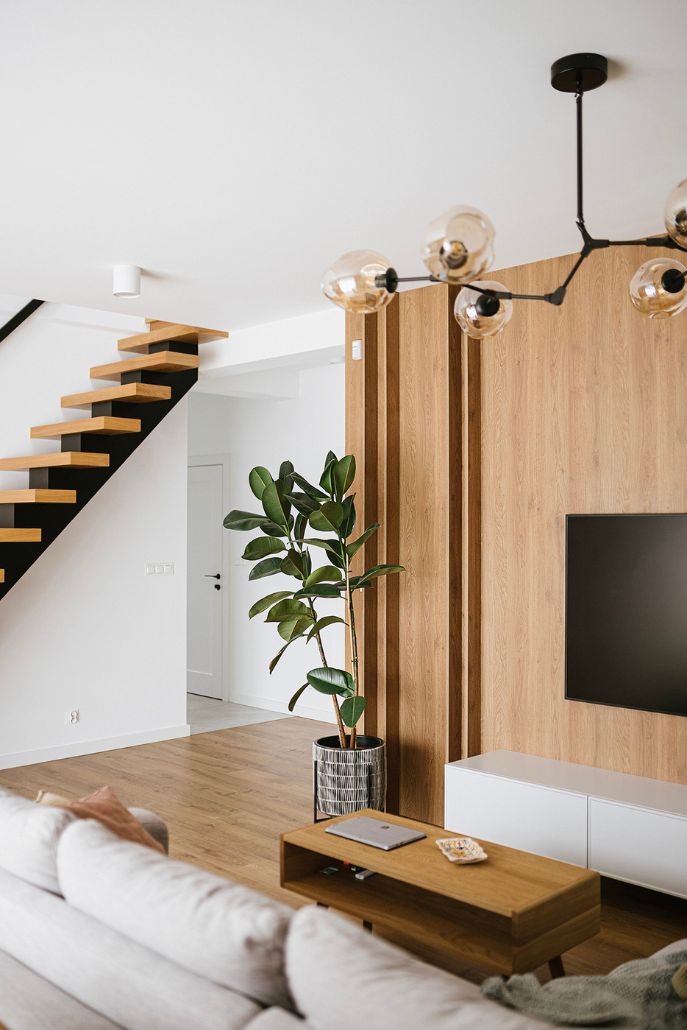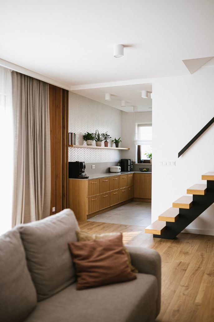 Wnętrza na zdjęciach zaprojektowane są w nowoczesnym stylu skandynawskim z elementami minimalizmu. Dominuje naturalne drewno, biel i szarości, które nadają wnętrzu ciepła i elegancji. Proste formy mebli, czarne akcenty i duża ilość roślin podkreślają harmonijny, funkcjonalny charakter aranżacji. Styl ten łączy przytulność z nowoczesnością, tworząc przestrzeń jasną, przestronną i sprzyjającą codziennemu relaksowi.