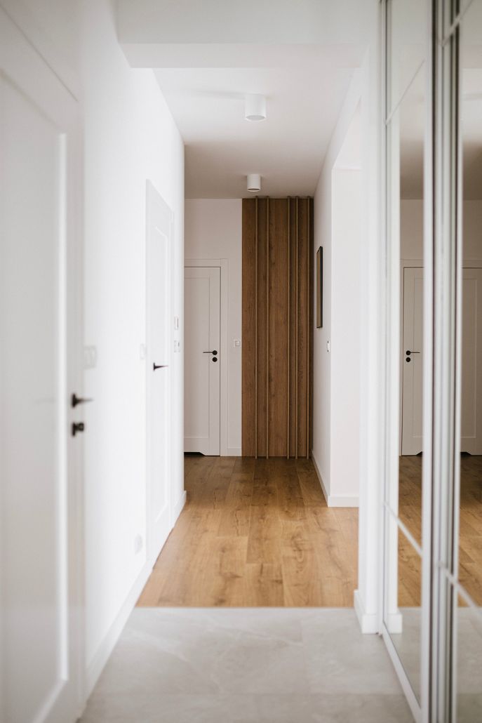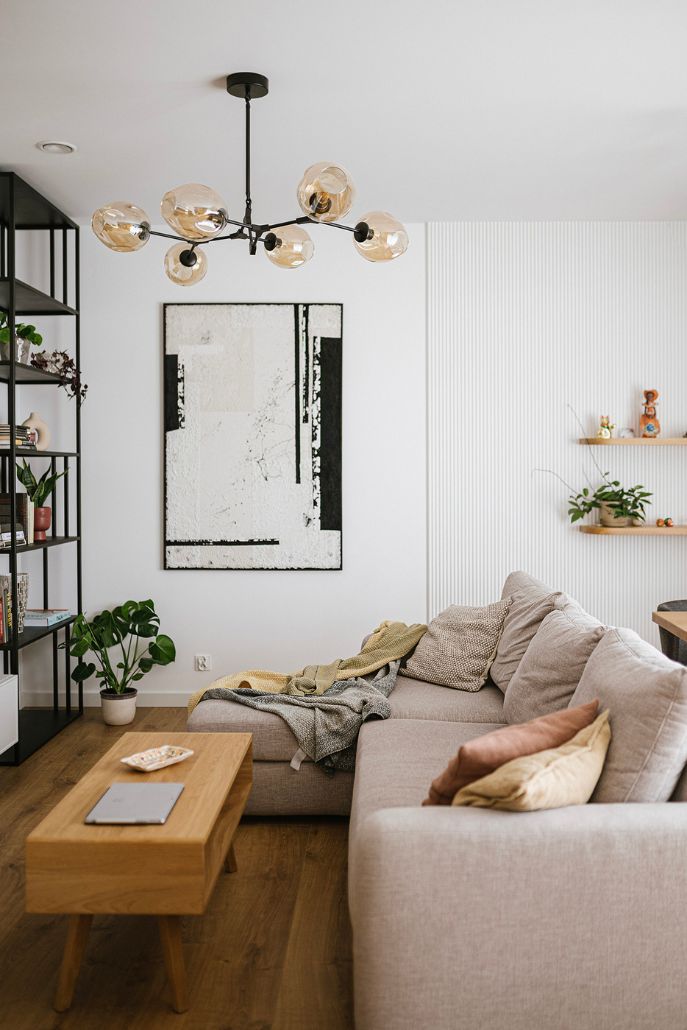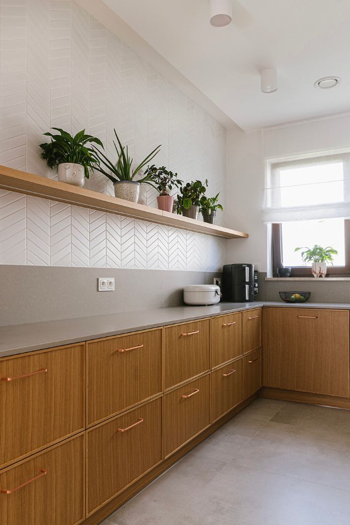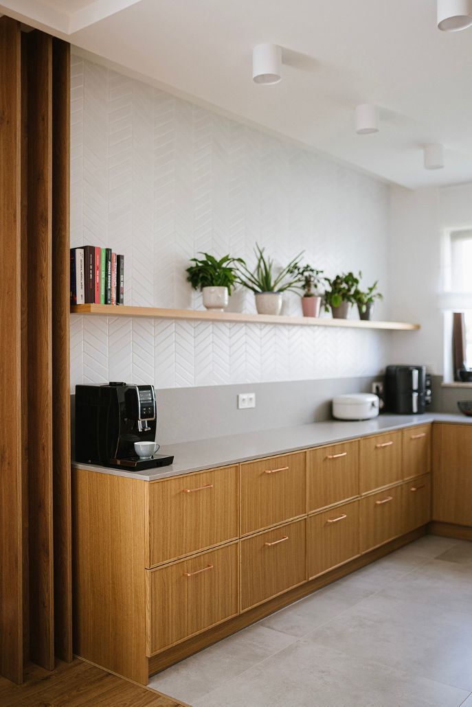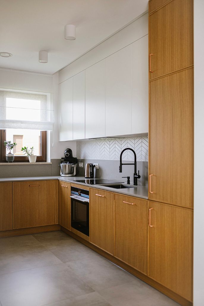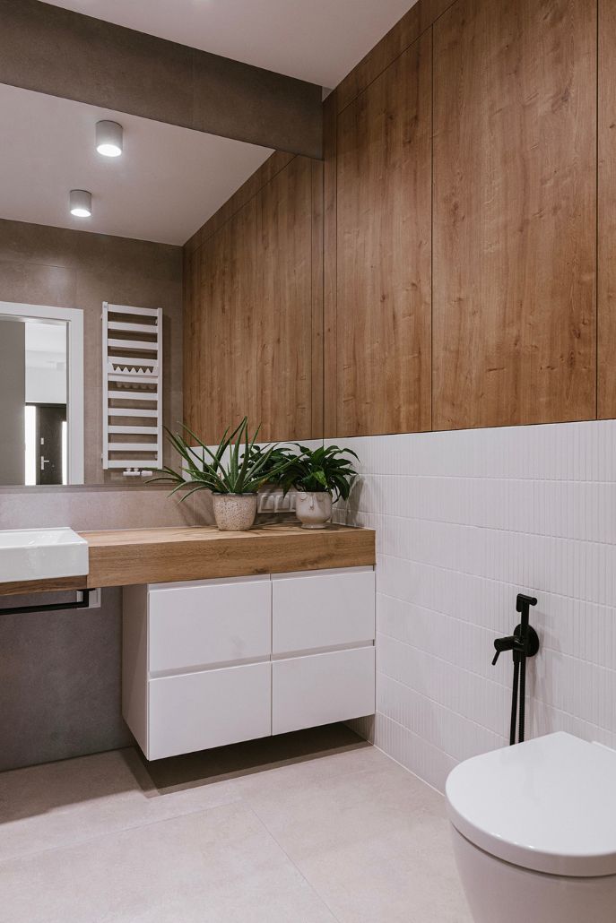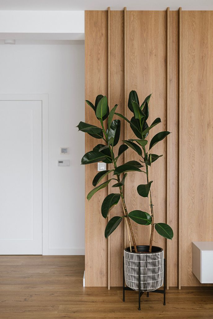 Wnętrza na zdjęciach zaprojektowane są w nowoczesnym stylu skandynawskim z elementami minimalizmu. Dominuje naturalne drewno, biel i szarości, które nadają wnętrzu ciepła i elegancji. Proste formy mebli, czarne akcenty i duża ilość roślin podkreślają harmonijny, funkcjonalny charakter aranżacji. Styl ten łączy przytulność z nowoczesnością, tworząc przestrzeń jasną, przestronną i sprzyjającą codziennemu relaksowi.