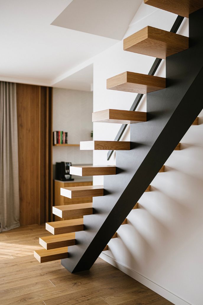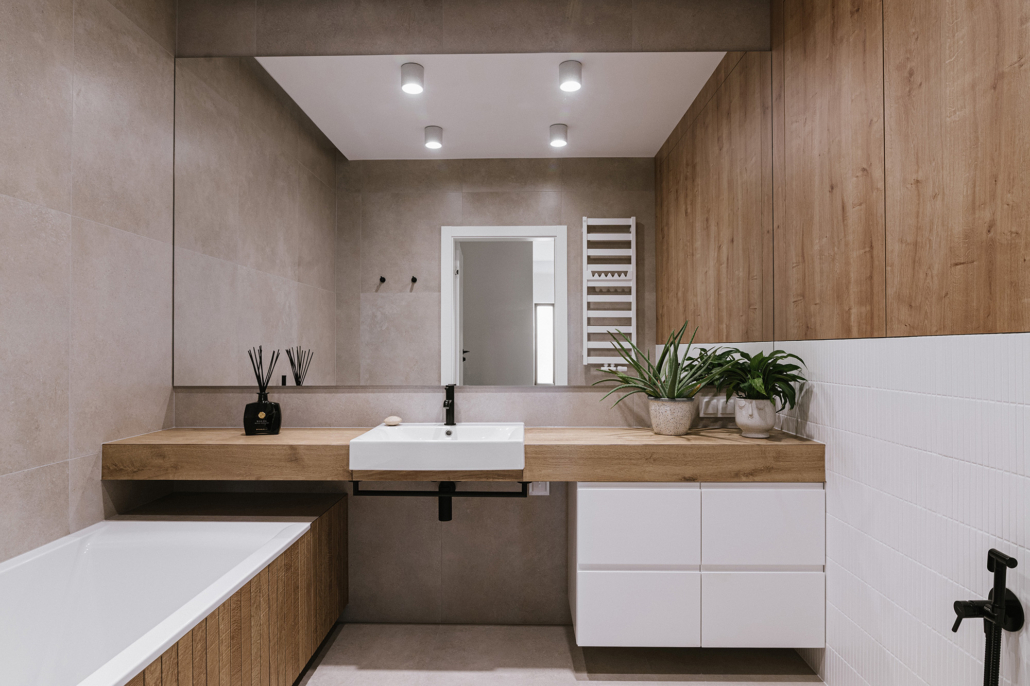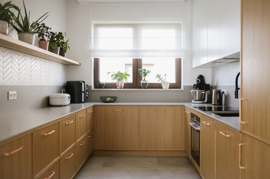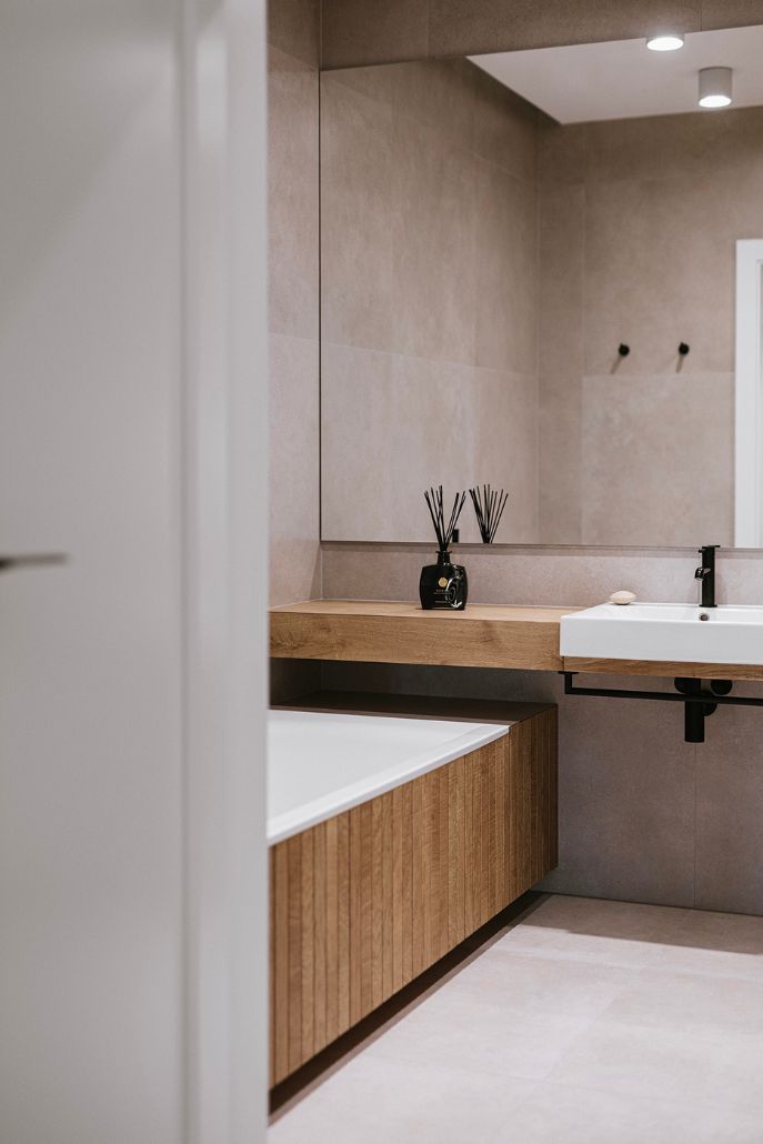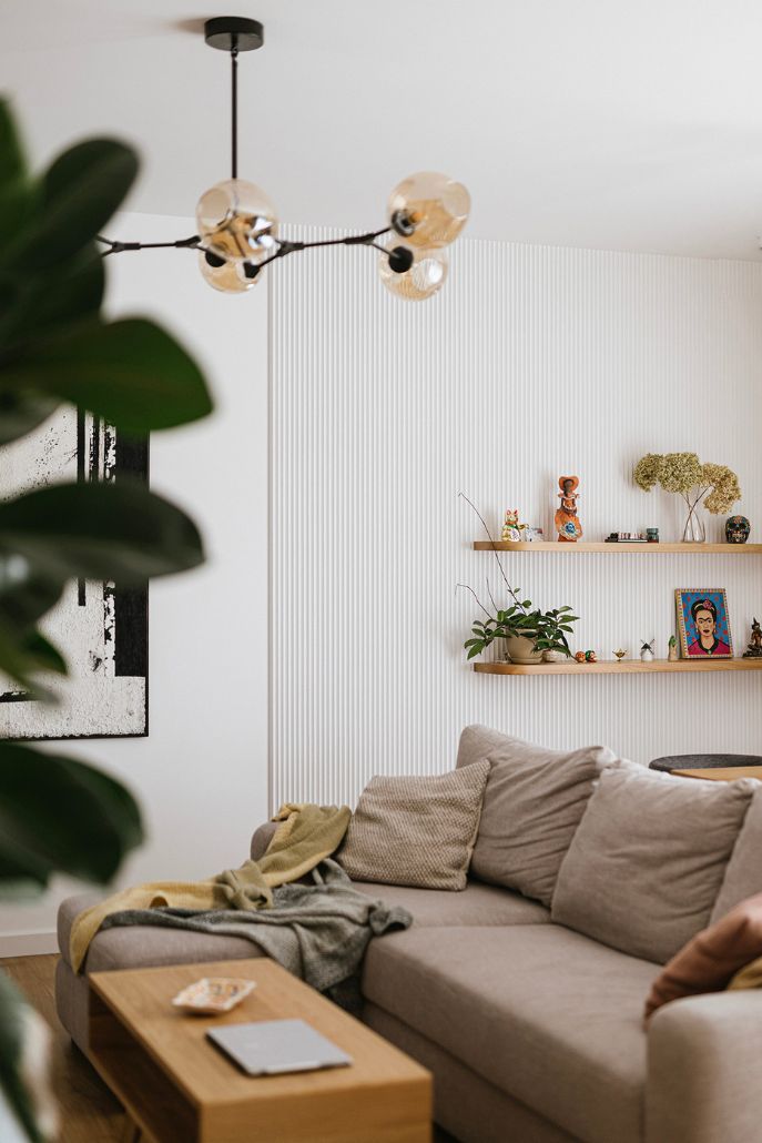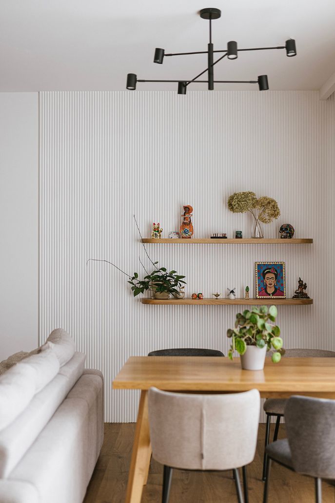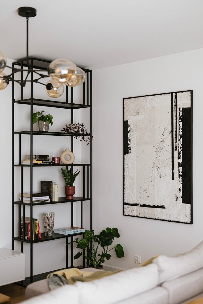 Wnętrza na zdjęciach zaprojektowane są w nowoczesnym stylu skandynawskim z elementami minimalizmu. Dominuje naturalne drewno, biel i szarości, które nadają wnętrzu ciepła i elegancji. Proste formy mebli, czarne akcenty i duża ilość roślin podkreślają harmonijny, funkcjonalny charakter aranżacji. Styl ten łączy przytulność z nowoczesnością, tworząc przestrzeń jasną, przestronną i sprzyjającą codziennemu relaksowi.